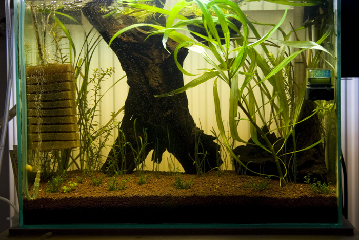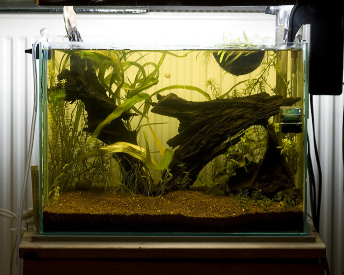 In primul rand acopera spatele acvariului cu ceva (lipesti o folie neagra/albastra) si acvariul va avea un aspect mult mai bun si fotografiile vor fi mai bune. Inchide luminile din camera sa nu ai reflexe.