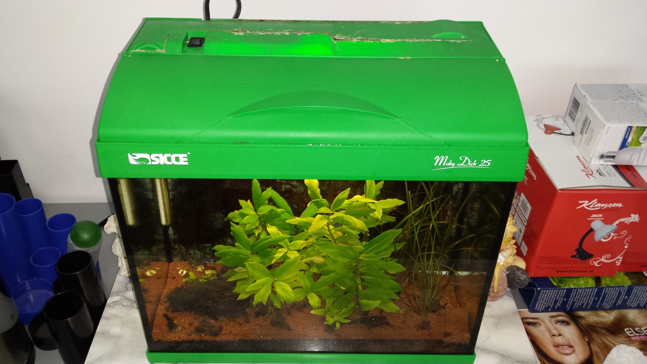 Momentan are totul in capac si lumina nu este suficienta asa ca am cumparat doua lampi care se agata pe marginea acvariului si un filtru cascada.