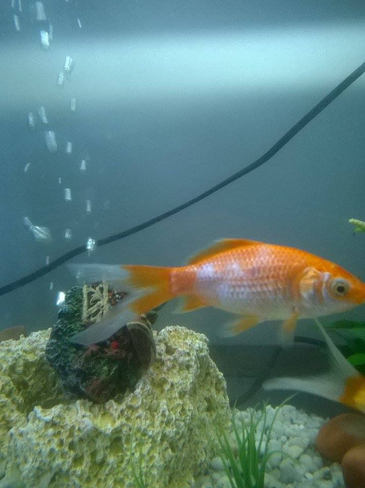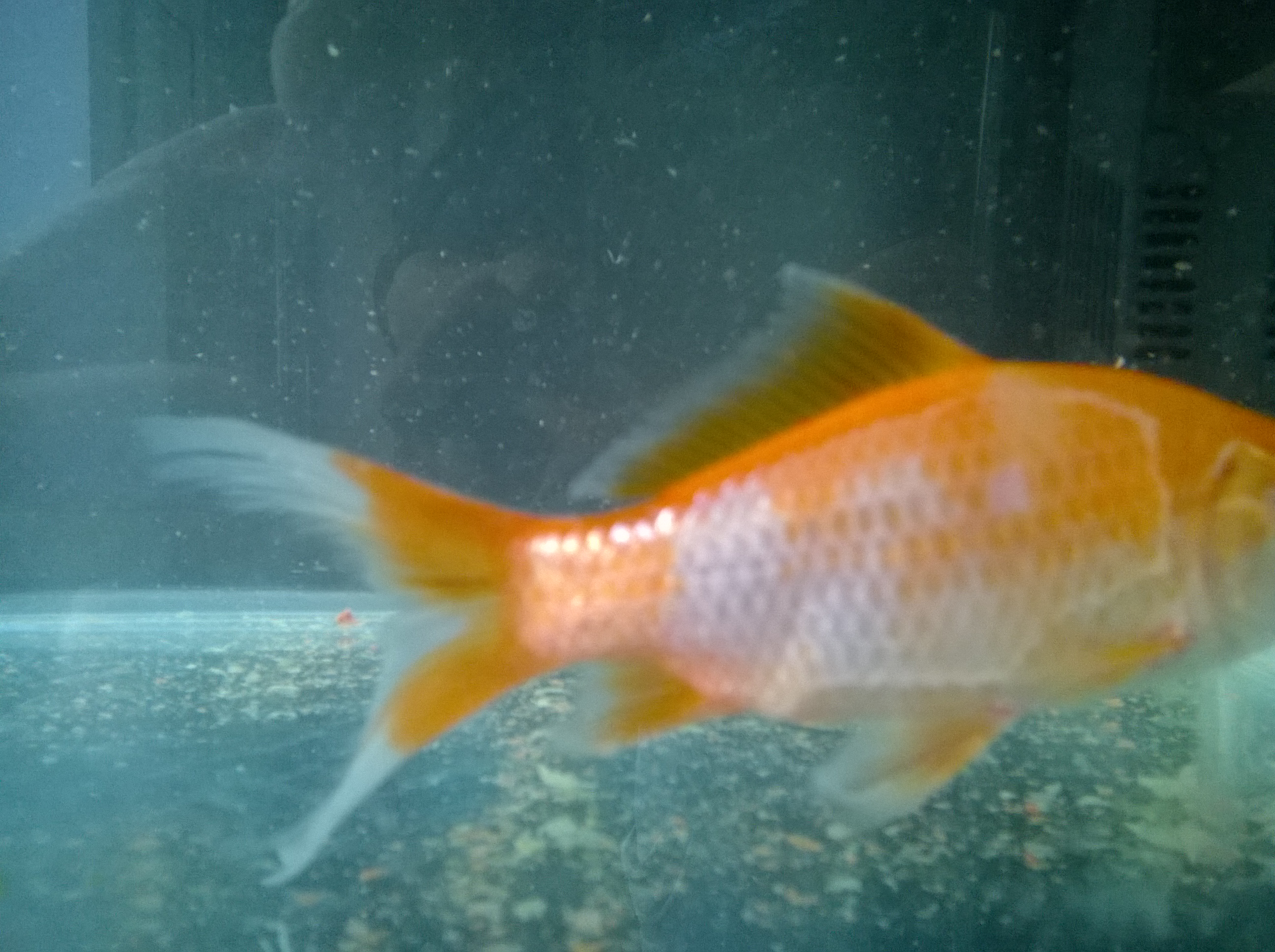 I-am zis.."hai baiatu' ca uite la frumoasa ta ce se agita la geam..." Acvariile.. cel mic si cel mare .. sunt unul linga celalalt.Pong (carasica)tot in sus si in jos,stinga dreapta.. in toate directiile cu botul pe geam ...unde era Ping.Dupa 5 minute in care am privit si l-am tinut in mina... incepuse sa respire mai bine...am inceput sa il curat... citeva fire de par care erau impletite pe el,dupa care i-am dat drumul.Statea gu guta la suprafata apei putin intr-o parte...nu misca dar respira...