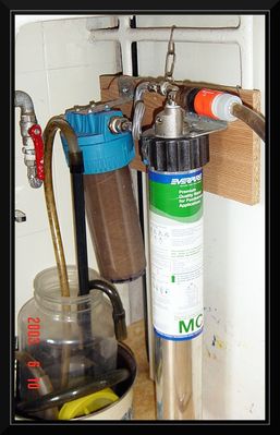 ... bateria de filtrare montata pe coloana de apa rece ... este compusa dintr-un filtru mecanic [ in partea stanga - cu capac albastru ] si un filtru chimic [ butelia "lunga" din partea dreapta este un cartus de carbon activ ] ...