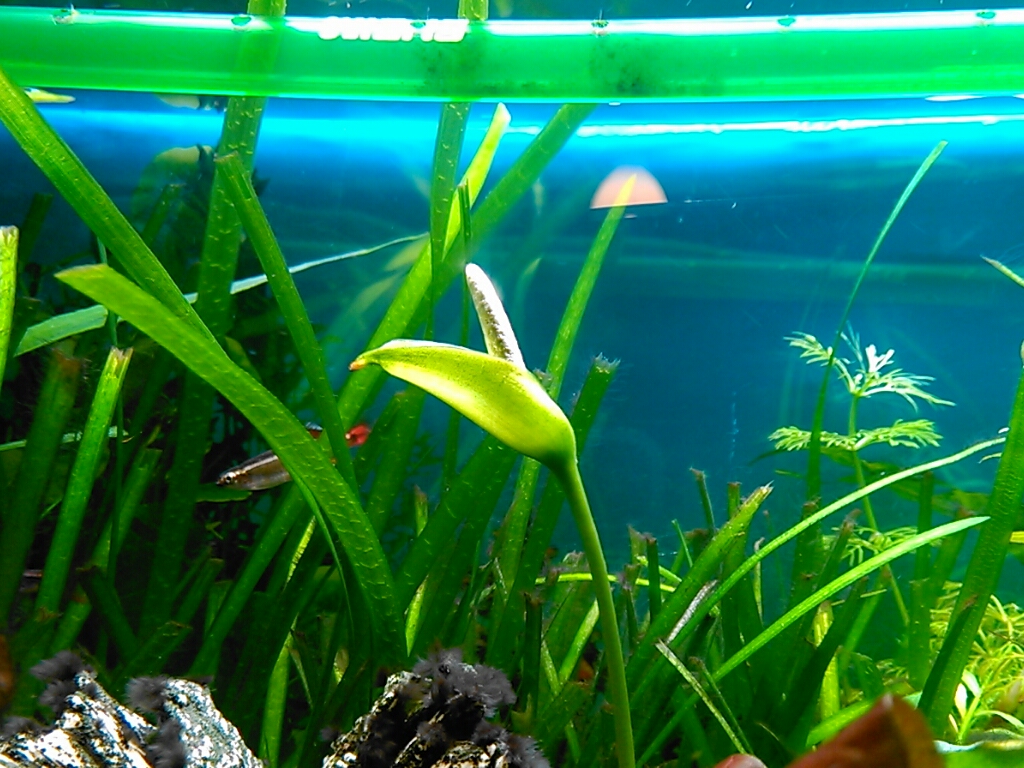 Astept cu nerabdare sa infloreasca un anubias (la inceput am crezut ca e o frunza noua, abia apoi am aflat de aici ca da fapt poate sa faca flori si sub apa). Am adaugat si cativa melci de substrat si, judecand dupa faptul ca nu i-am mai vazut dupa aceea decat sporadic (si a trecut ceva timp), presupun ca nu e o problema cu inmultirea lor, deci e semn bun  in ceea ce priveste starea generala a acvariului.