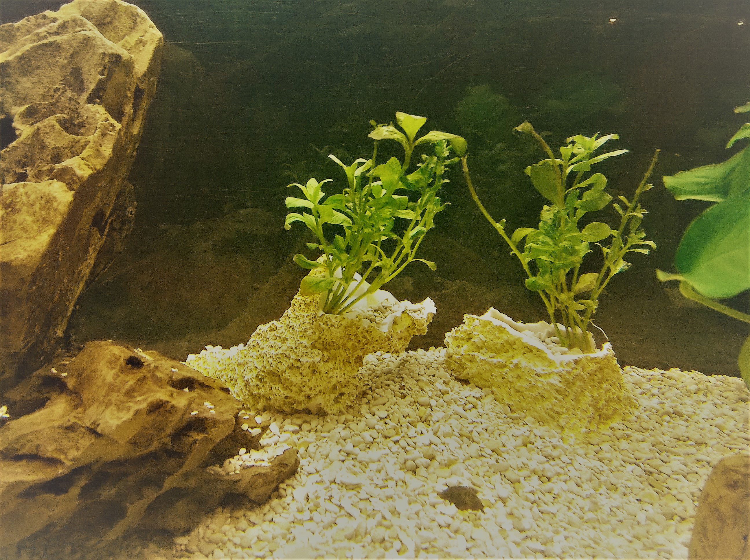 OK, foarte frumos. Acum trebuie sa gasesti o planta pentru mijloc-fundal, ceva cu crestere rapida si care sa dezvolte o tufa; iti trebuie cefa care sa devina centru focal. In partea de mijloc si mai in fata ar merge (cred eu) Hydrocotyle Tripartita sau Cryptocorine Wendtii. Apoi poti sa mai adaugi cite ceva, treptat. Succes!