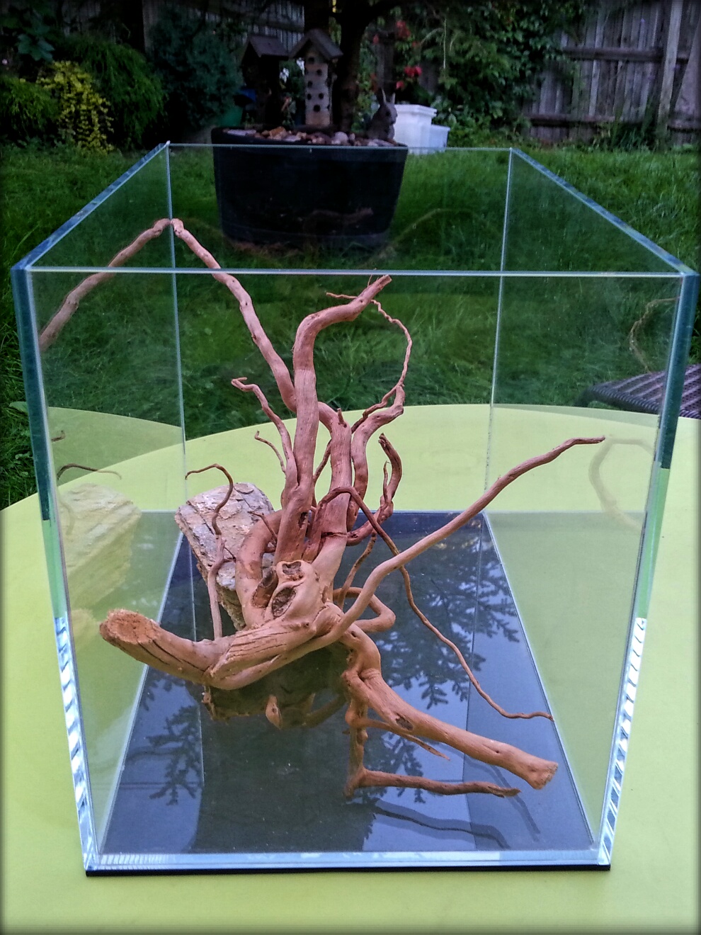 Am decis sa incerc aceeasi manevra pe un acvariu de sticla, cel pe care il tin afara doar pe o piatra de aer. L-am golit, curatat, lasat peste noapte la dezinfectat cu inalbitor concentrat.