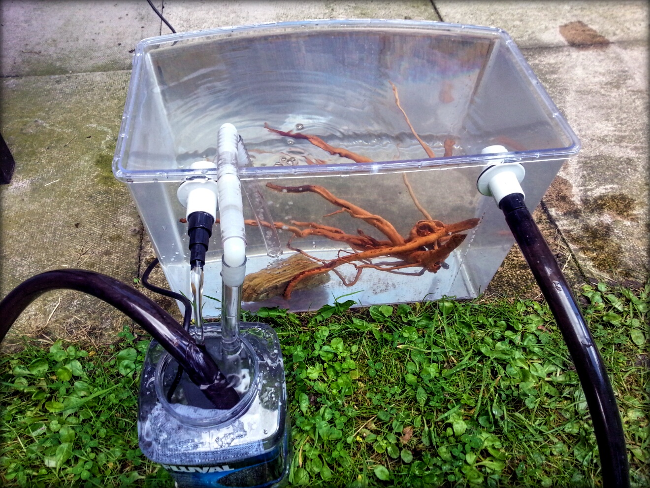 Cutia de 1L de la carbunele Fluval am pus-o pe post de reactor: overflowul se varsa in ea, apoi se revarsa mai departe.
