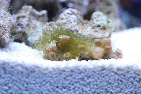 Acvariul marin de 30L a fost la un moment dat neingrijit si micile bucatele de Zoas pe care am reusit sa le gasesc pe la magazine (caci nu pot sa cumpar pietroaie pline, n-am loc) s-au umplut de alge. Spre deosebire de micile Plate Corals care nu par sensibile la alge (adica se umfla oricum la lumina si se strang noaptea), zoas nu se mai deschideau.