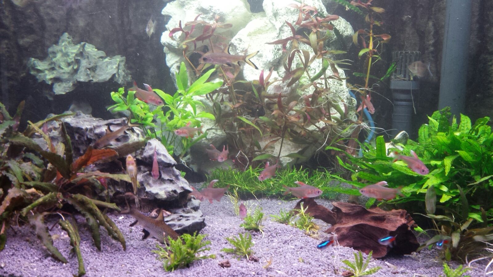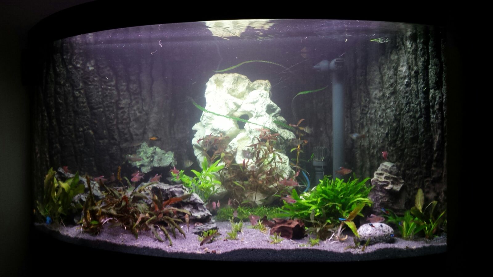 Deci, in loc sa dotez acvariul meu de 60l am gasit unul de 350 second hand cu tot cu plante si pesti.