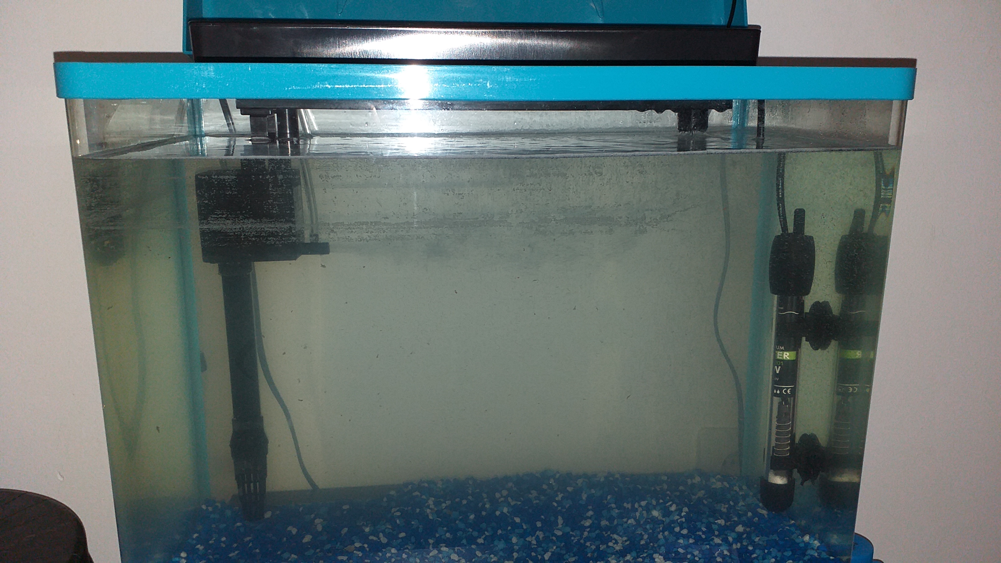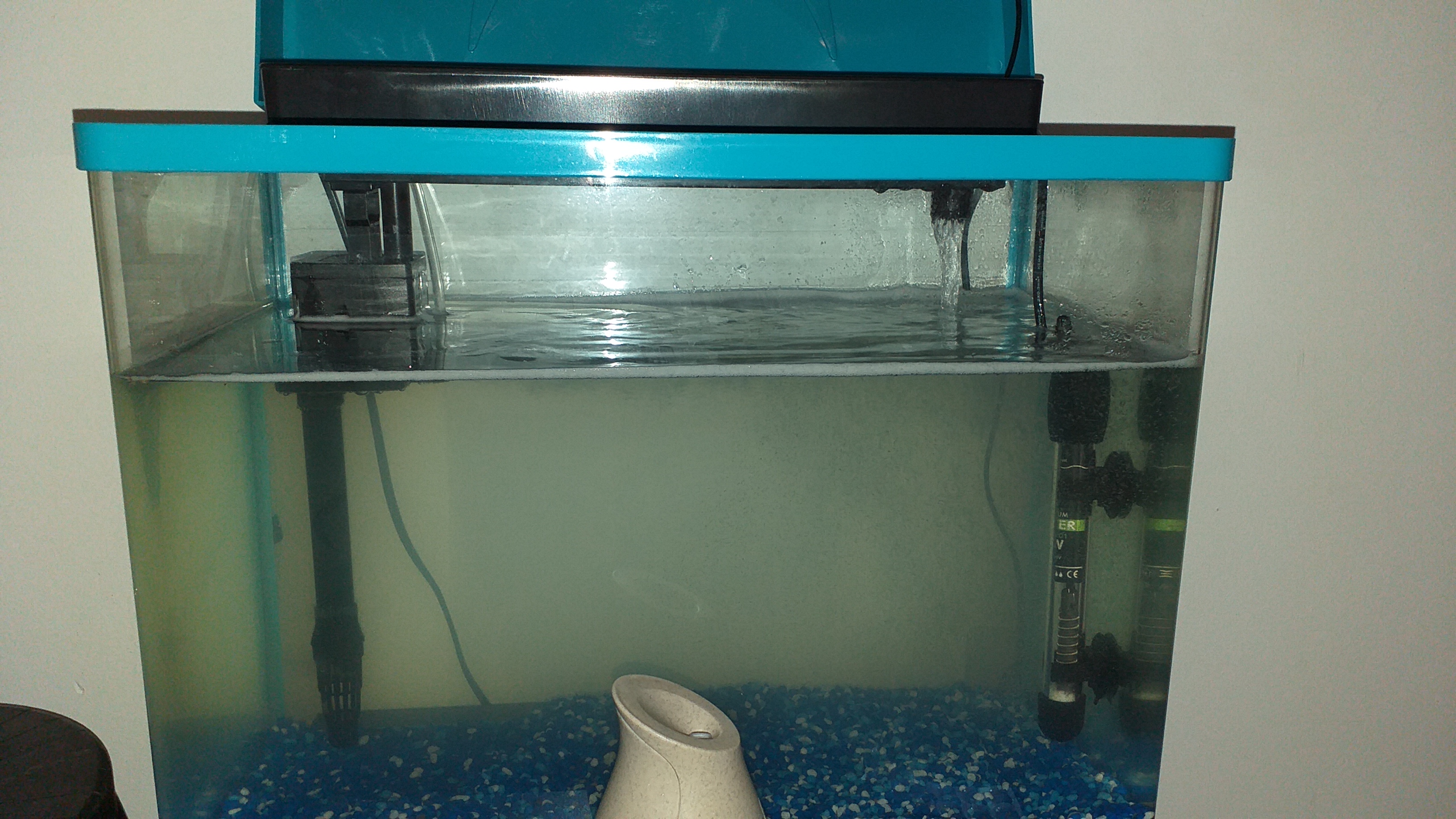 De ce nu il umpli pina sus? Cu cit mai multa apa, cu atit mai bine. Pune un skimmer. Oxigeneaza apa (bacteriile nitrificatoare sunt aerobe) prin valurirea apei. Inca mai poti inlocui acel ... substrat. Un quart negru, care e si ieftin, e mai potrivit. Oricum, filtrul nu te va ajuta prea mult. Un Eheim 2213 ar fi mult mai potrivit.